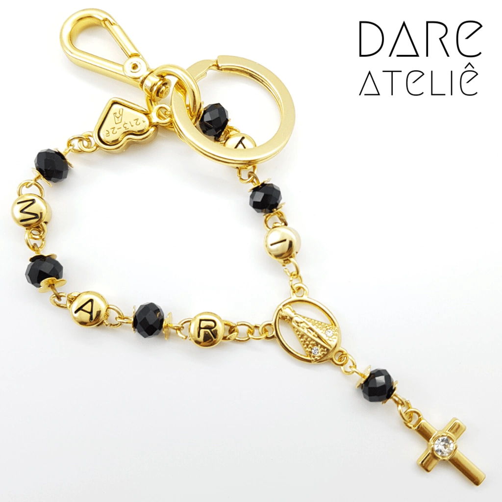 Material metal Zamac que não enferruja e com banho em verniz ouro para maior durabilidade. Contas em cristal de vidro médio preto. Fecho coração com ímã, pingente medalha Nossa Senhora com dois pontos de luz e crucifixo com ponto de luz, verso escrito "Gratidão". Pode ser usado com ou sem o fecho do chaveiro.